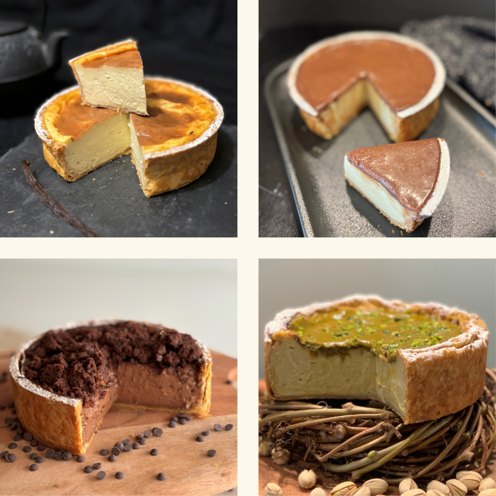 On vous propose la farandole des Pâtissiers : Le Pâtissier Vanille de Madagascar, le Pâtissier Chocolat-crumble cacao, le Pâtissier Pistache, le Pâtissier Coco. Bien sûr tous bio, peu sucrés et ultra frais car réalisés sur commande !