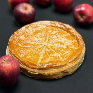 Dans la pure tradition, cette galette est composée de notre pâte feuilletée au beurre Montaigu (85), garnie de crème d’amandes. Réalisée à base de sucre roux, de beurre de Pamplie (79) et d’amandes complètes, la crème est relevée avec une pointe de rhum et de vanille.