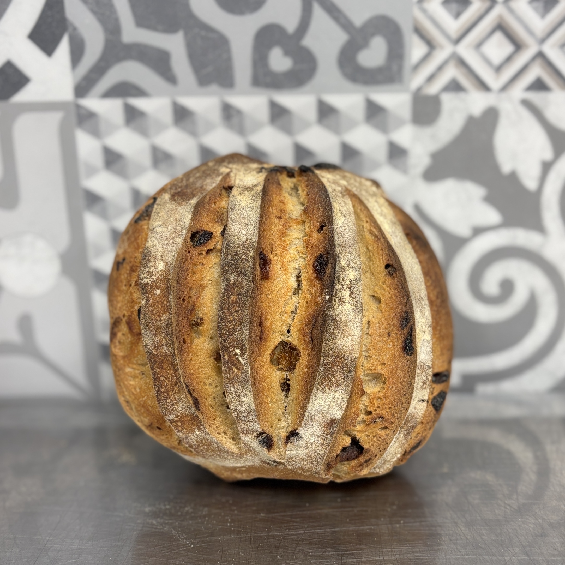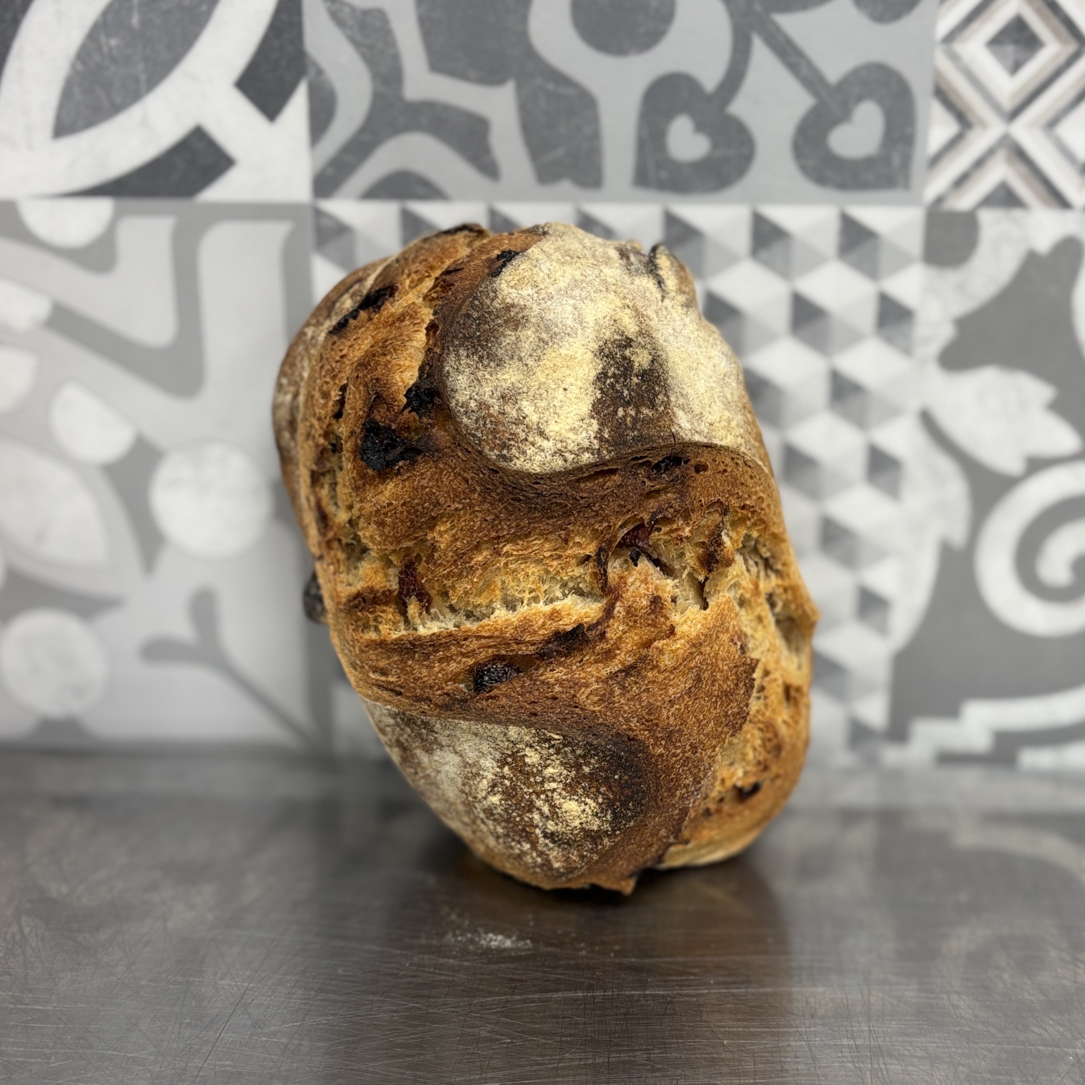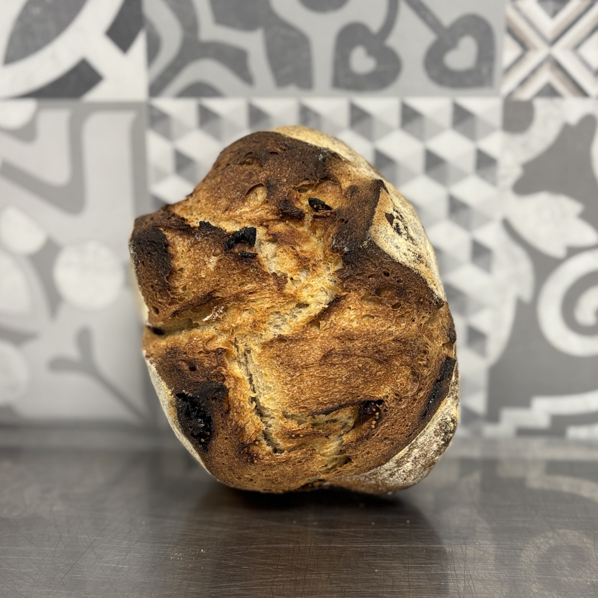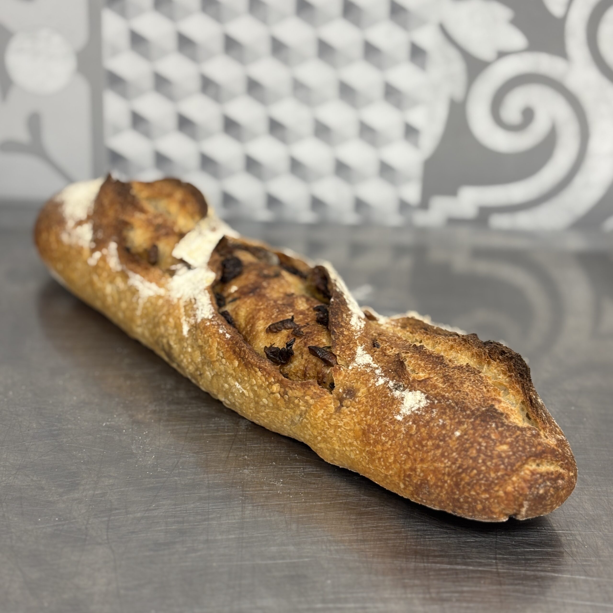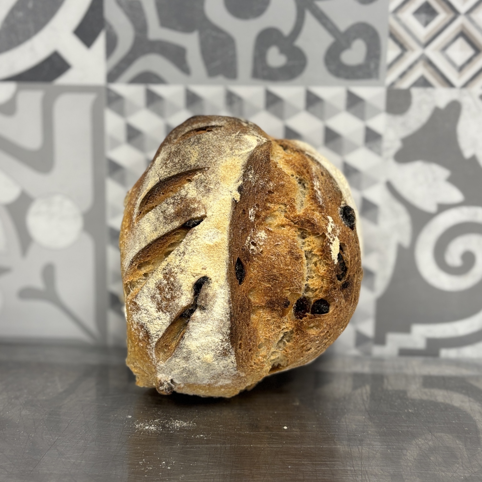 Pain aux olives, aux tomates séchées, à l’ail, à l’origan et au levain naturel (en boutique seulement le vendredi)