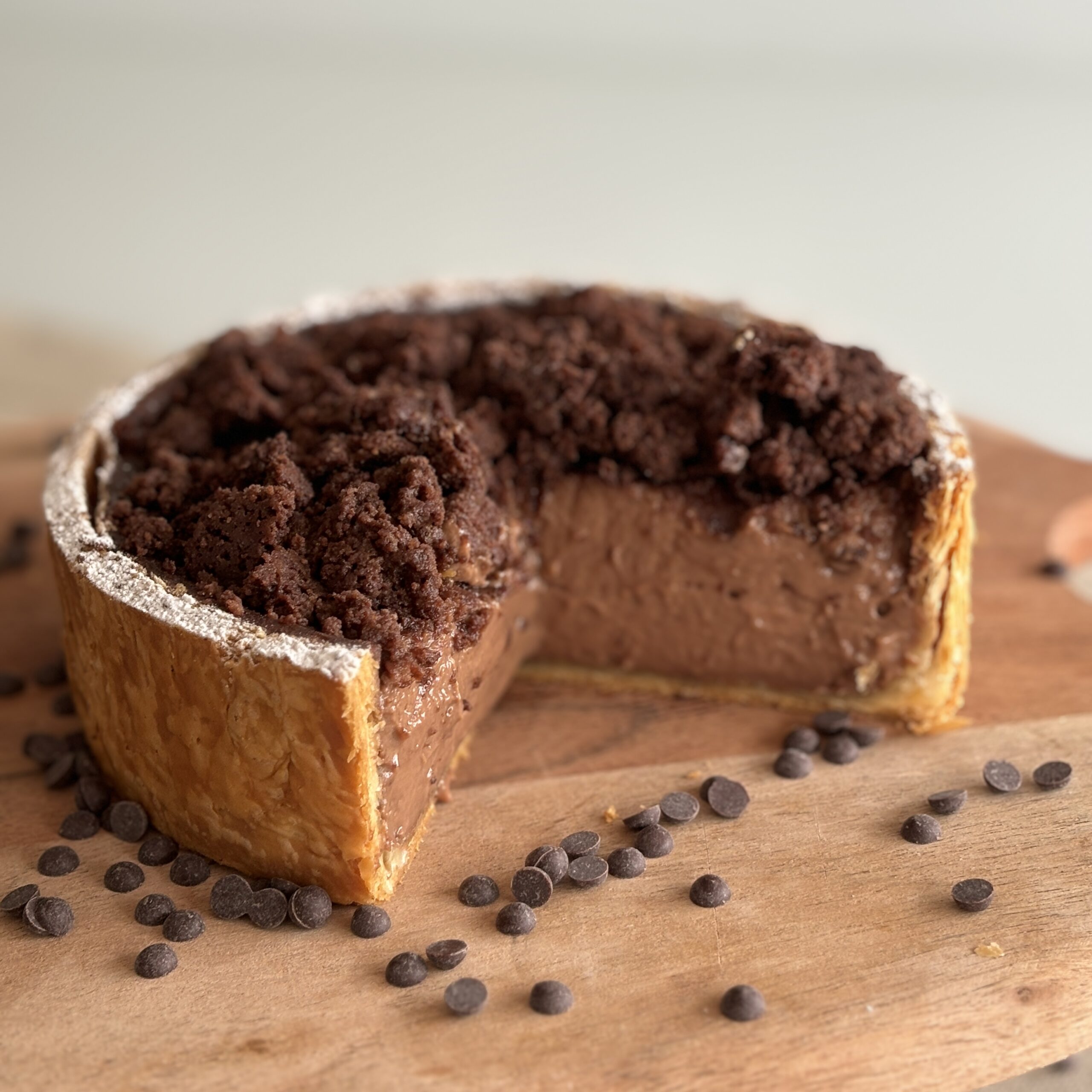 Flan pâtissier au chocolat recouvert de crumble au chocolat