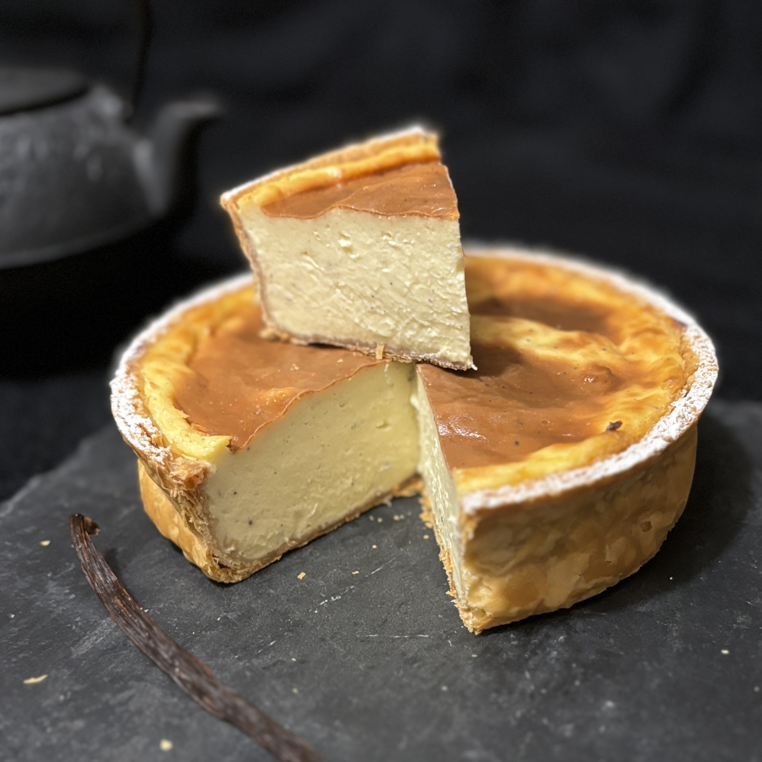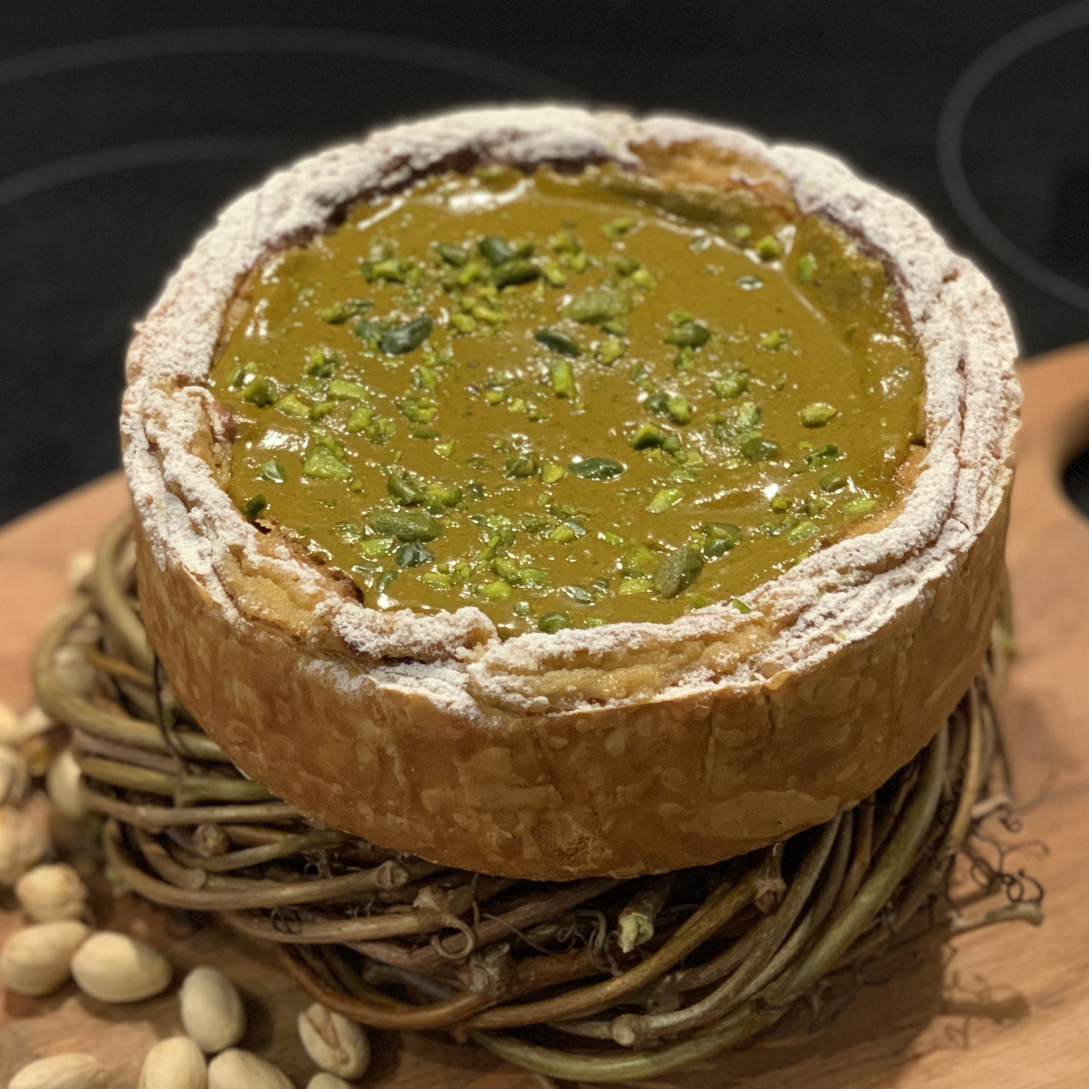 Flan pâtissier à la pistache recouvert de praliné à la pistache