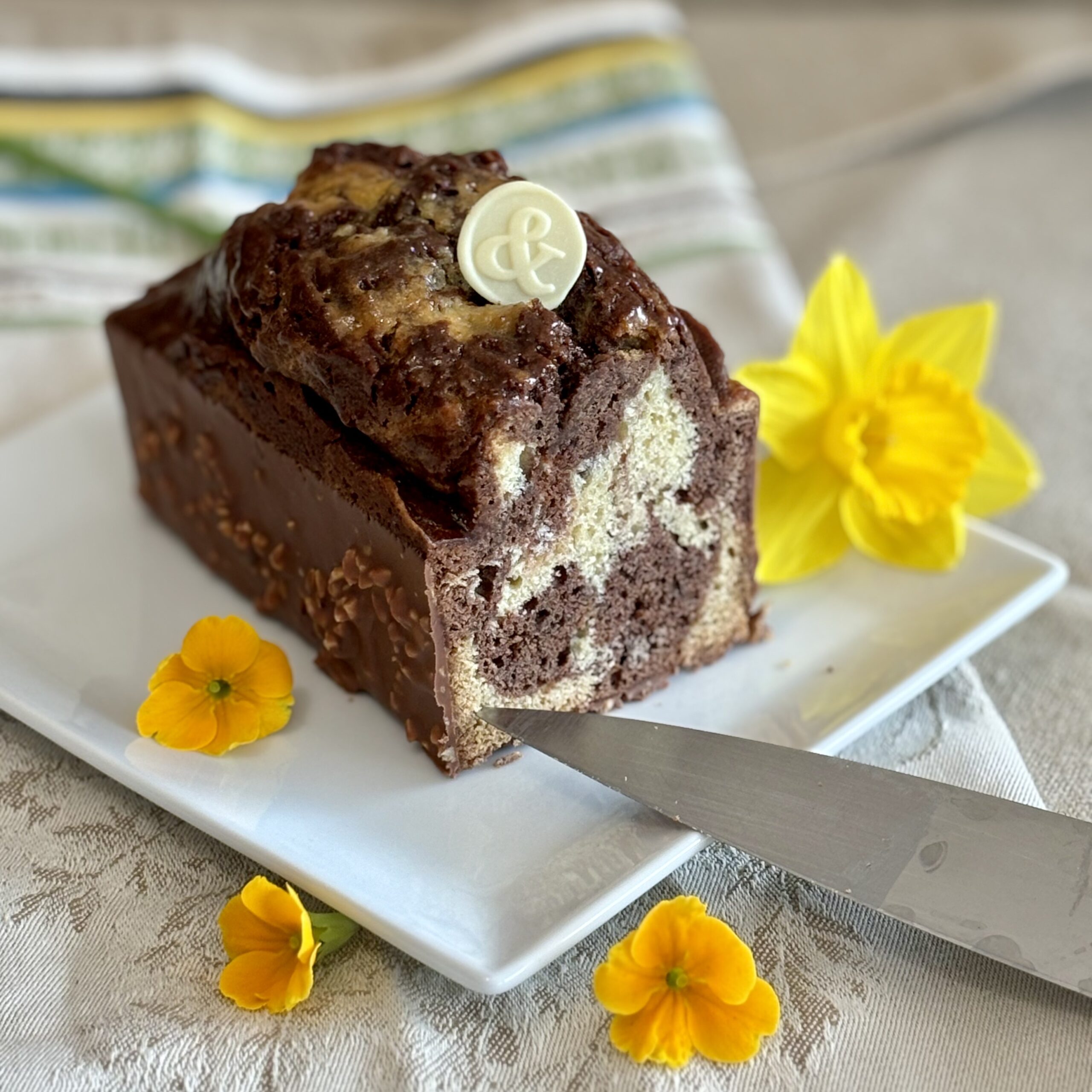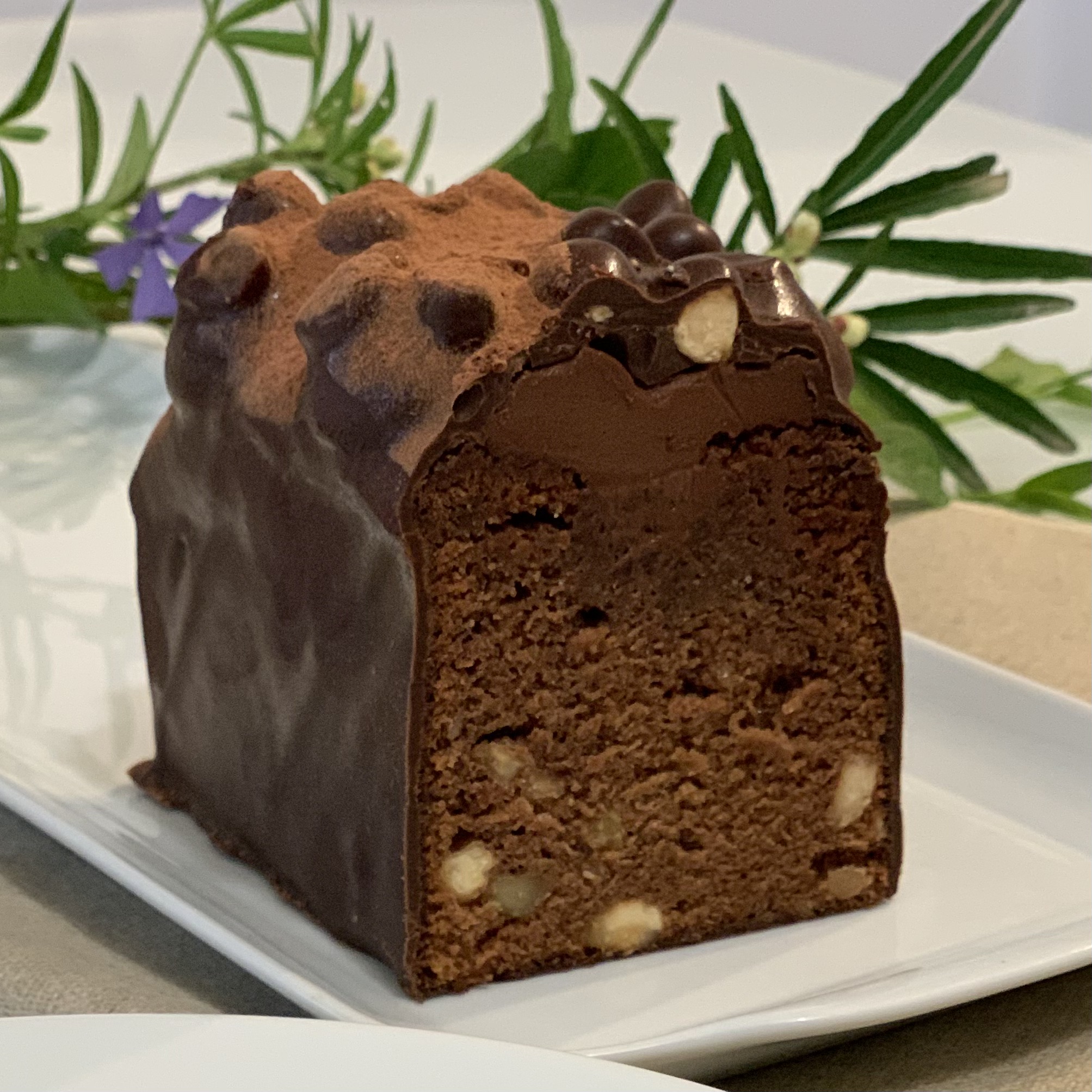 Cake au chocolat et au noisettes, recouvert de ganache au chocolat, coque chocolat