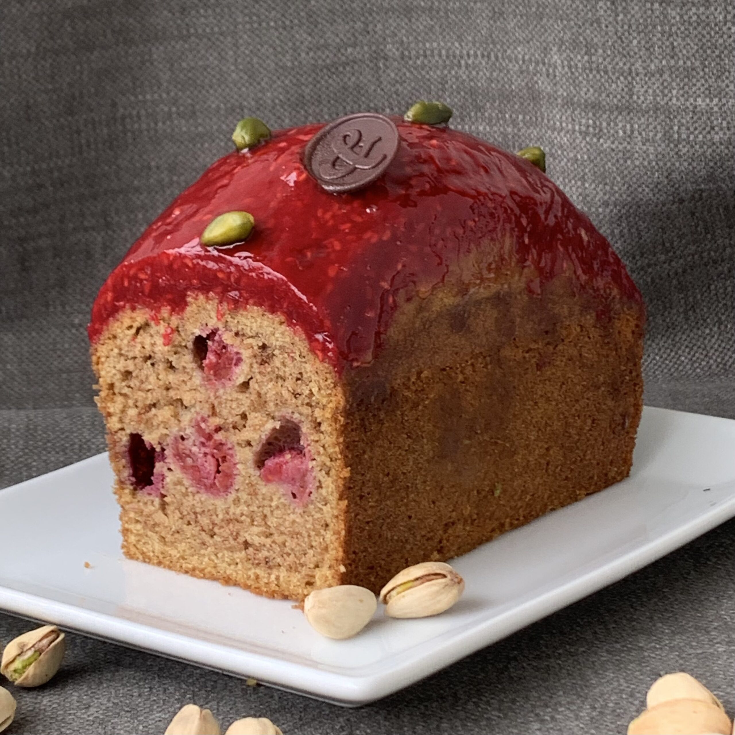 Cake à la pistache et aux framboises, recouvert de confit de framboises