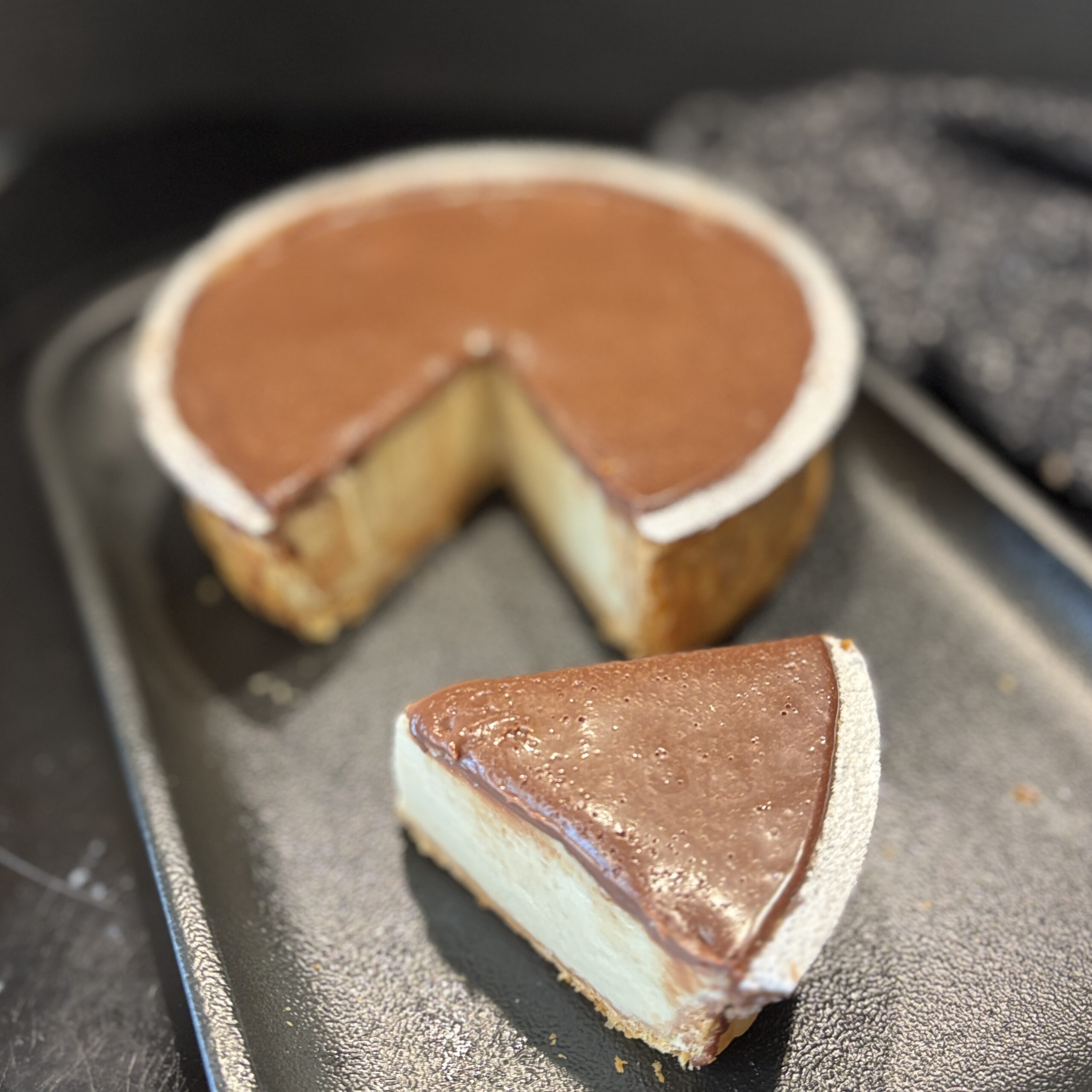 Flan pâtissier au lait de coco, recouvert de ganache au chocolat au lait